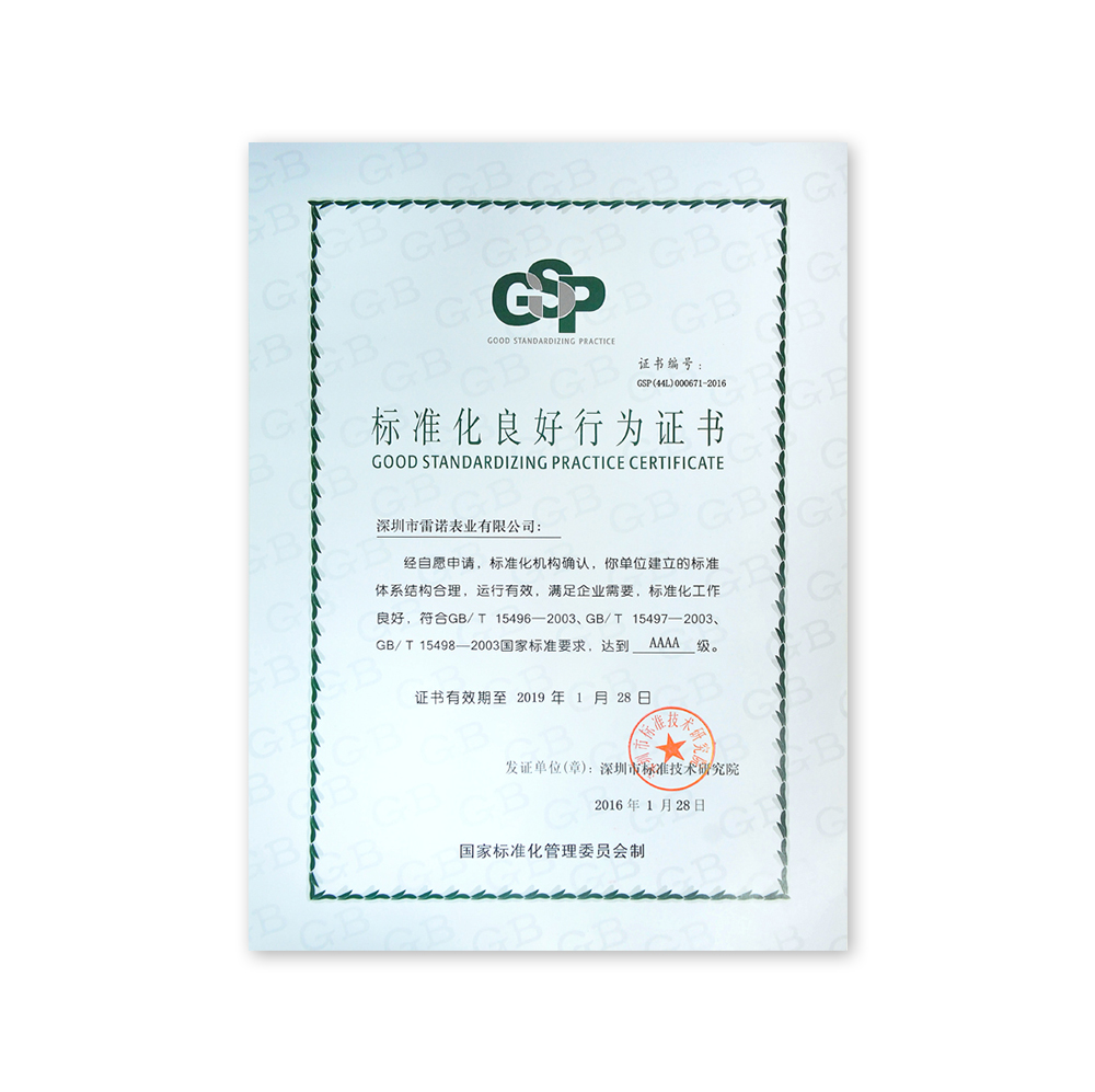 雷諾表早在2011年導入企業標準化體系,并于2012年被確認為“AAAA級標準化良好行為企業”,時至今日,雷諾表標準化體系已健康運作三年;2016年1月27日,專家組通過審查標準體系資料及運行記錄、查看生產現場和技術中心實驗室,對雷諾表標準化工作給予了高度評價。