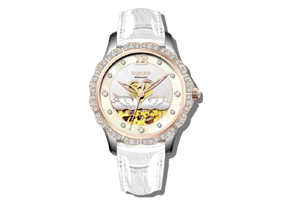 主打知性商務(wù)風(fēng)的夜色系列,在去年推出備受市場歡迎的“天鵝守護(hù)”陶瓷款之后,再度升華“守護(hù)”概念,加入更多代表幸運(yùn)的“水晶”元素,花瓣形表圈鑲嵌48顆不對稱水晶石,增添腕表的璀璨與時(shí)尚,天然貝母面,使腕表更優(yōu)雅華美。表盤中心兩只天鵝相依成心形,象征忠貞不渝的愛情和守護(hù),極致唯美浪漫。